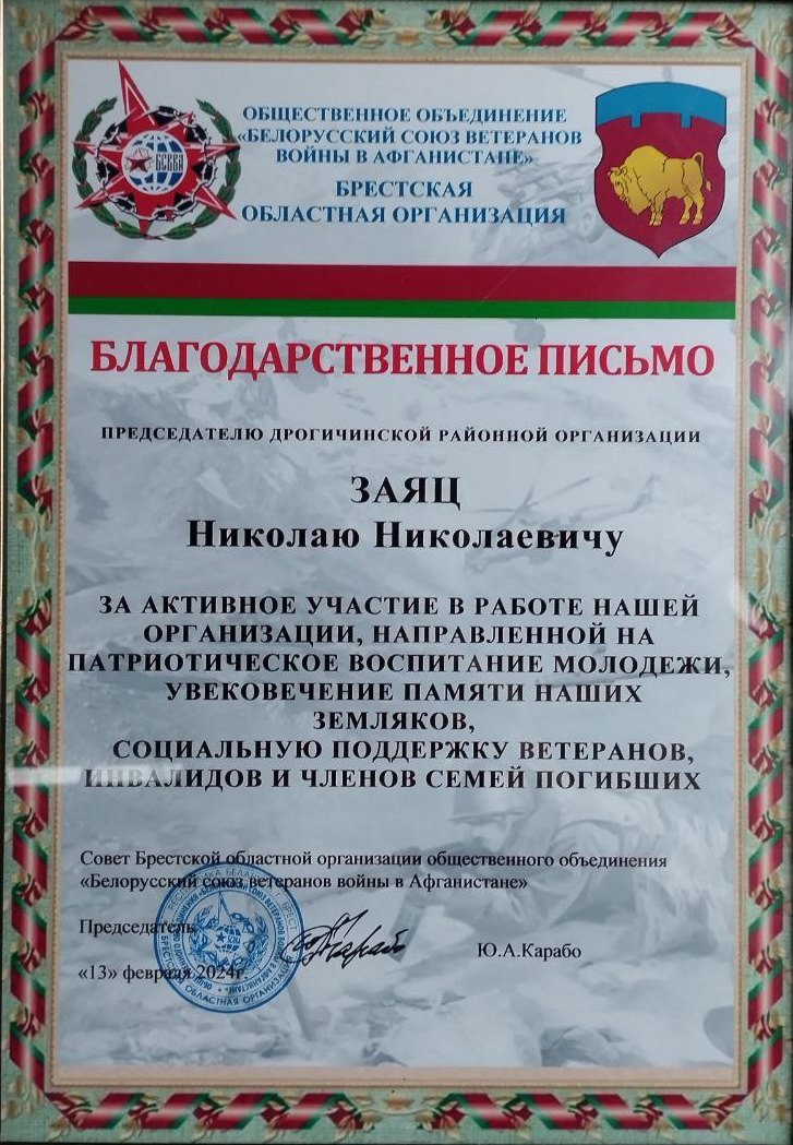 Nikolai Nikolaevich ZAYATS, chairman of the Drogichinsky district organization of the public association "Belarusian Union of Veterans of the War in Afghanistan" was awarded a commemorative medal for the 35th anniversary of the withdrawal of Soviet troops from Afghanistan and a certificate.