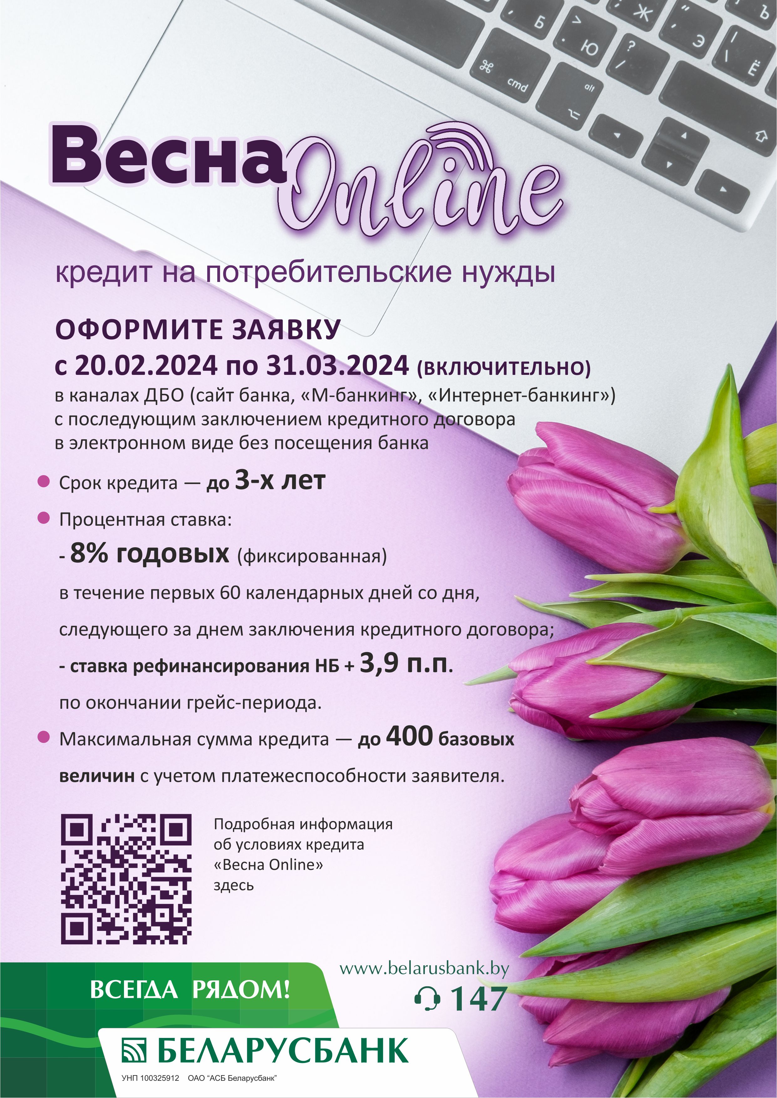 ААТ "ААБ Беларусбанк" з 20.02.2024 ажыццяўляе прыём заявак на новы спажывецкі крэдыт "Вясна Online", працэнтная стаўка ад 8 працэнтаў гадавых (фіксаваная). Аформіць заяўку на крэдыт можна без наведвання банка-праз Інтэрнэт-банкінг, Мабільны банкінг і карпаратыўны сайт. Спяшайцеся! Прыём заявак па 31.03.2024 г. Уключна!!! Тэлефоны для даведак: 53418, 53405, 53398.