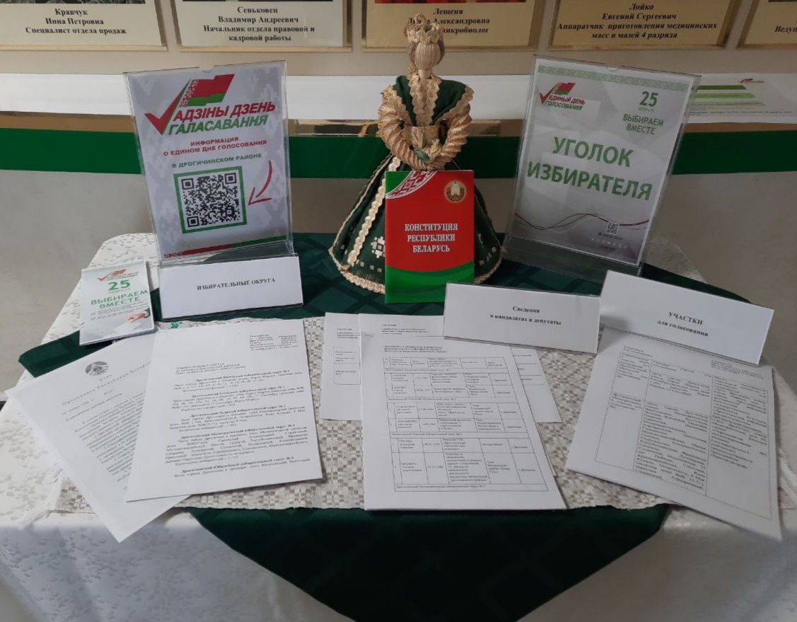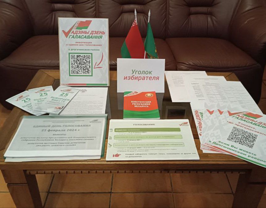 The main documents are presented in the corners: the Constitution of the Republic of Belarus and the Election Code of the Republic of Belarus. Information leaflets with a QR code “Information about the Unified Voting Day in the Drogichin region” are also posted, as well as information about the established polling stations.