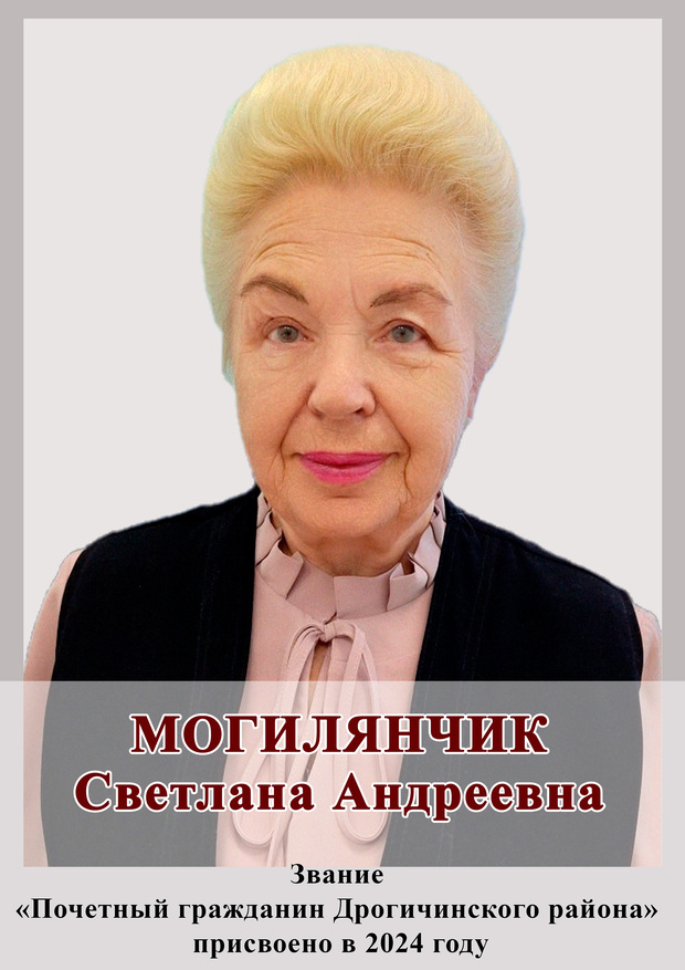 Председатель Дрогичинской районной организации Белорусского общественного объединения ветеранов, 1946 года рождения. Более 40 лет работала в Дрогичинском районе на разных должностях. С 2012 года возглавляет районную ветеранскую организацию, которая ежегодно проделывает немалую работу по защите прав и интересов ветеранов войны и труда, привлечению их к активной общественной жизни, ведет целенаправленную, систематическую работу по патриотическому воспитанию молодого поколения. Светлана Андреевна 5 раз избиралась депутатом Дрогичинского районного Совета депутатов, 8 лет возглавляла районную организацию Белорусского Фонда Мира. Награждена Почетными грамотами государственных органов разных уровней. За достигнутые высокие результаты и большой личный вклад в социально-экономическое развитие района по итогам работы за 2015 год в номинации “Занятость, социальная защита, благотворительность” Светлане Андреевне присвоено почетное звание “Человек года”.