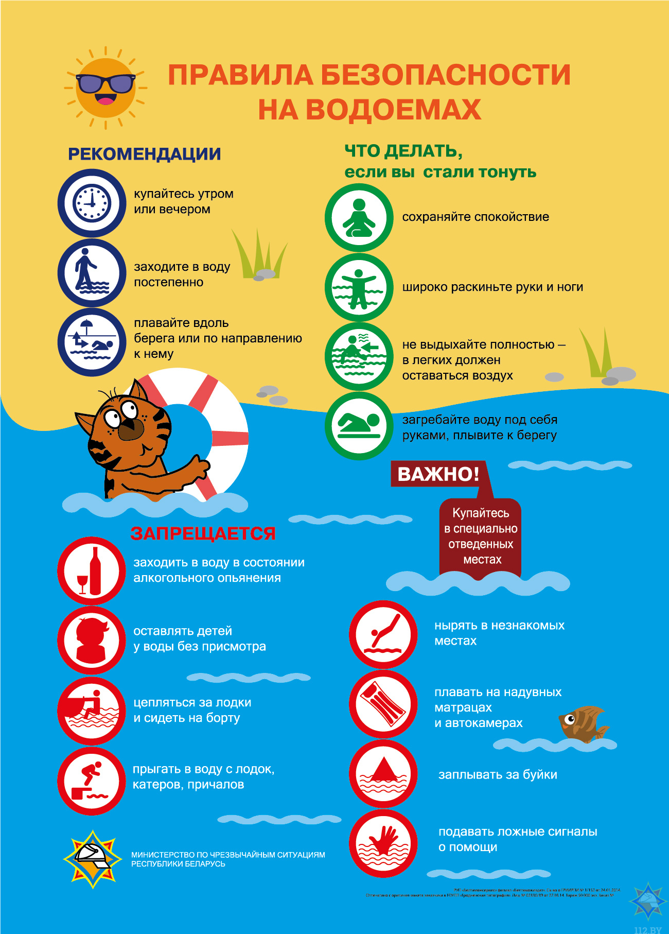Помните, что купание разрешено только на специально оборудованных пляжах, крайне опасно плавать и нырять в незнакомых для отдыха местах. Воздержитесь от употребления спиртного на водоеме. Не ныряйте с разбегу, заходите в воду постепенно, чтобы дать телу привыкнуть к перепаду температур и избежать спазмов кровеносных сосудов.