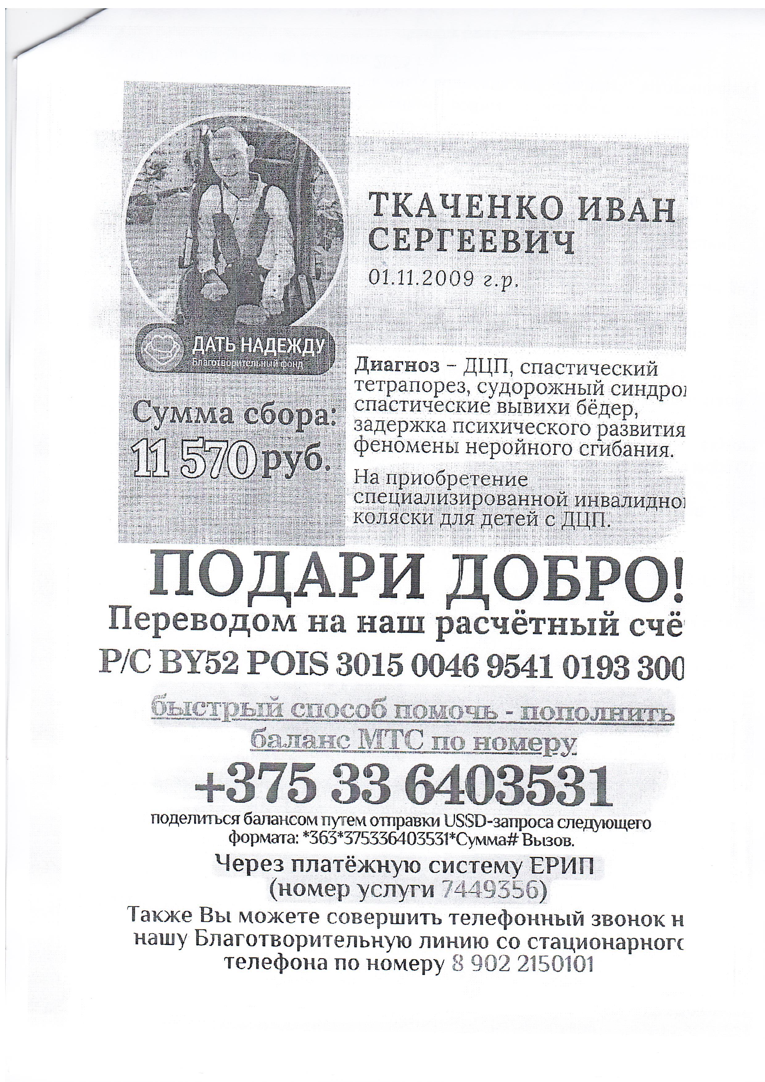 Местный благотворительный фонд "Дать надежду" просит оказать помощь в сборе средств на лечение и реабилитацию Ткаченко Ивану Сергеевичу 01.11.2009 г.р.