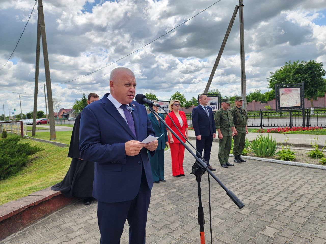 В мероприятии приняли участие руководство Дрогичинского района во главе с председателем райисполкома Сергеем Пачко, военный комиссар района подполковник ВС РБ Александр Палей, настоятель храма Покрова Пресвятой Богородицы в аг. Радостово иерей Леонид Коледа, представители трудовых коллективов, общественности и учащиеся школ города.